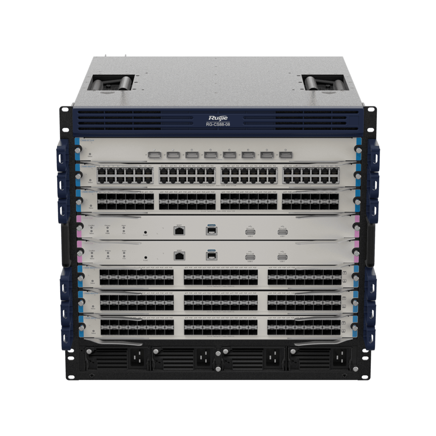 RG-CS88-08 switch, which can accommodate 6 service cards and 2 supervisor engines, 2 modular fan slots (2 fan modules are equipped by default)